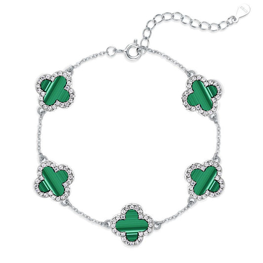 Premium Silver Iced Black Malachite Clover Bracelet
