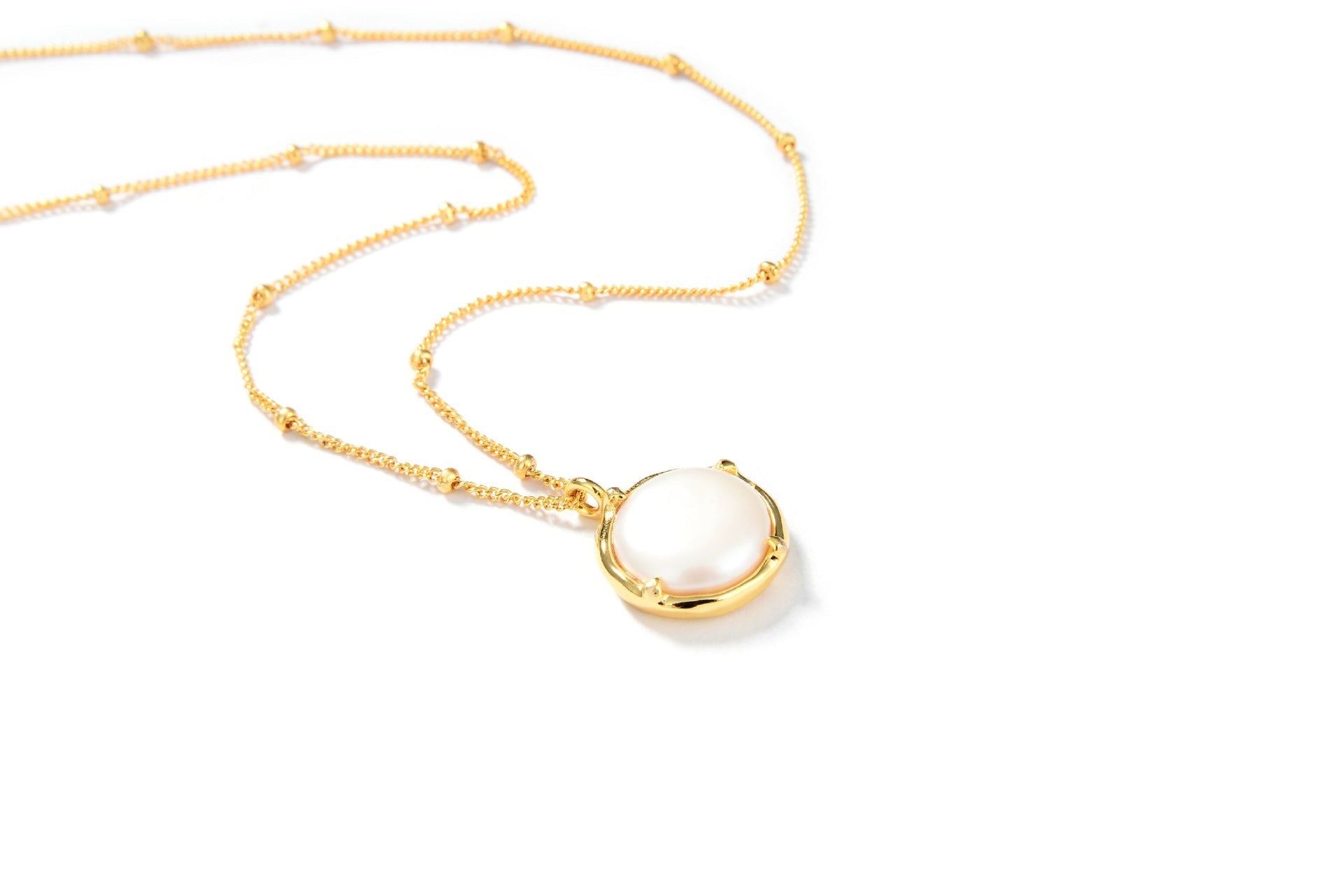 Handcrafted baroque button pearl necklace featuring natural freshwater pearls. Comes with a 16.5-inch chain and a 0.51 × 0.51 inch pendant, offering a timeless and elegant look.