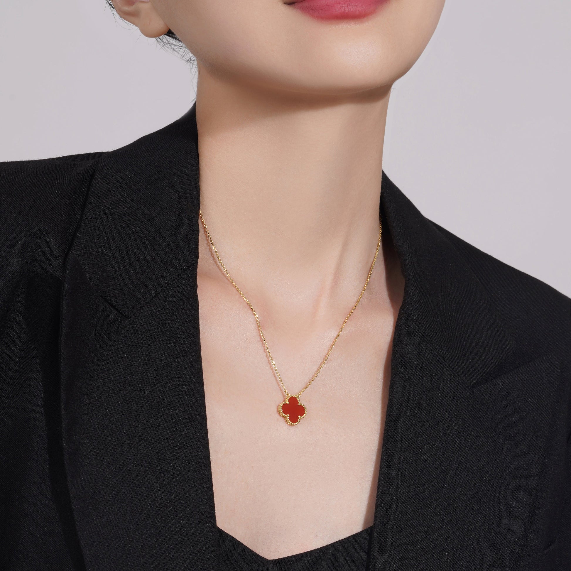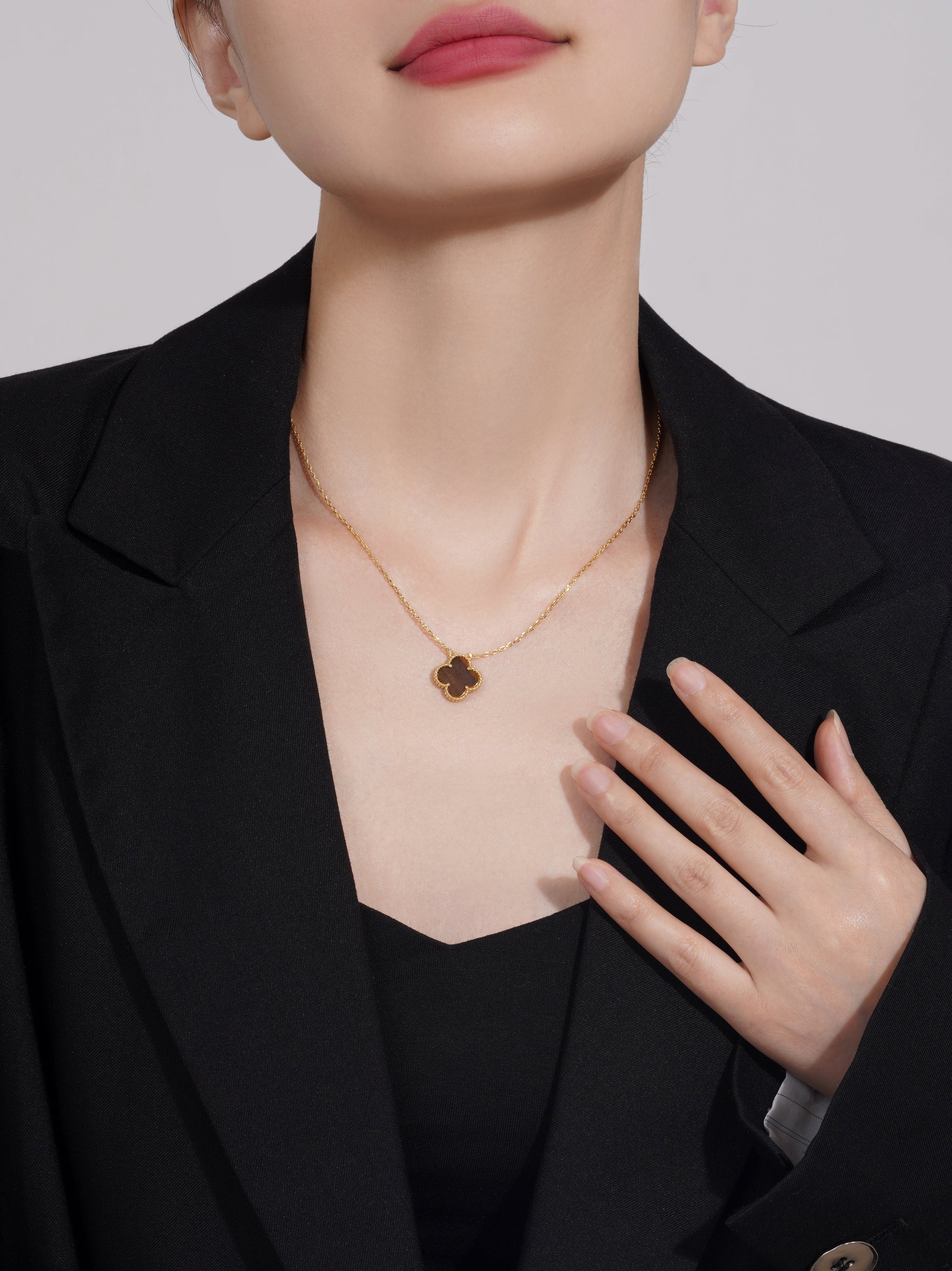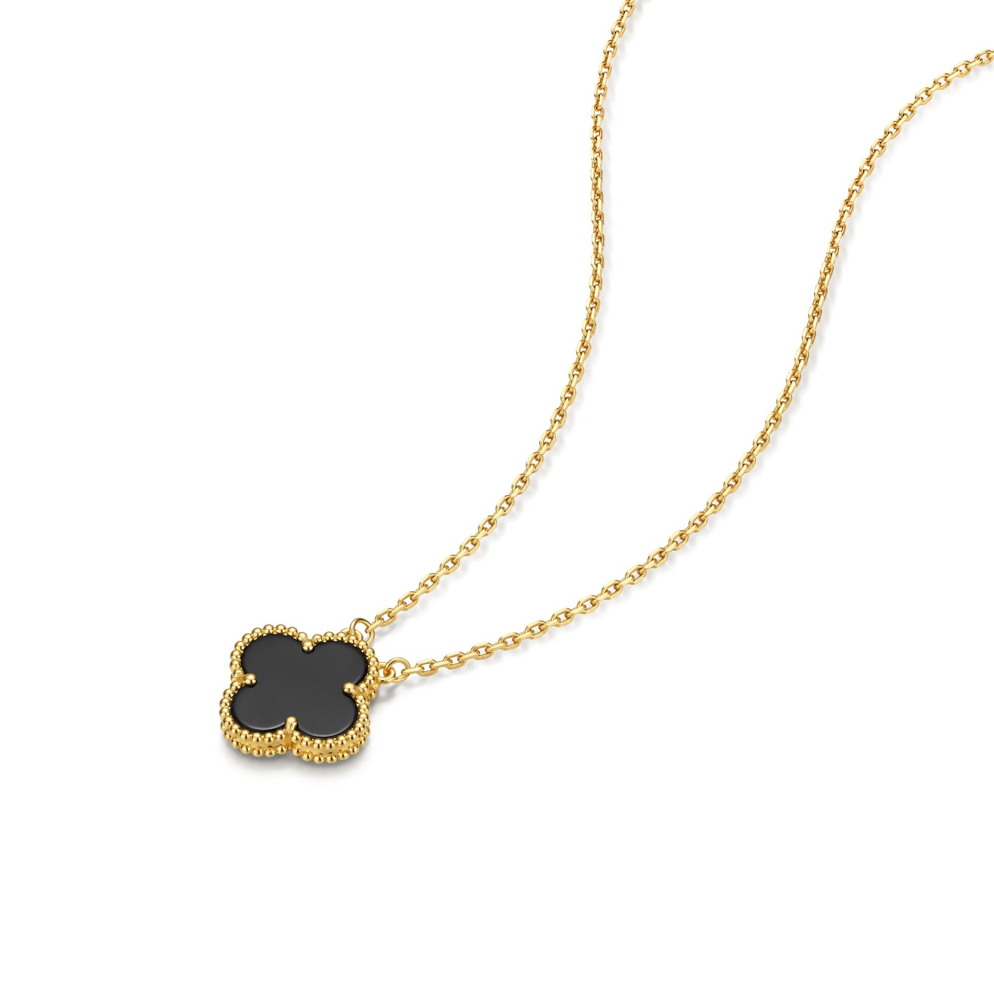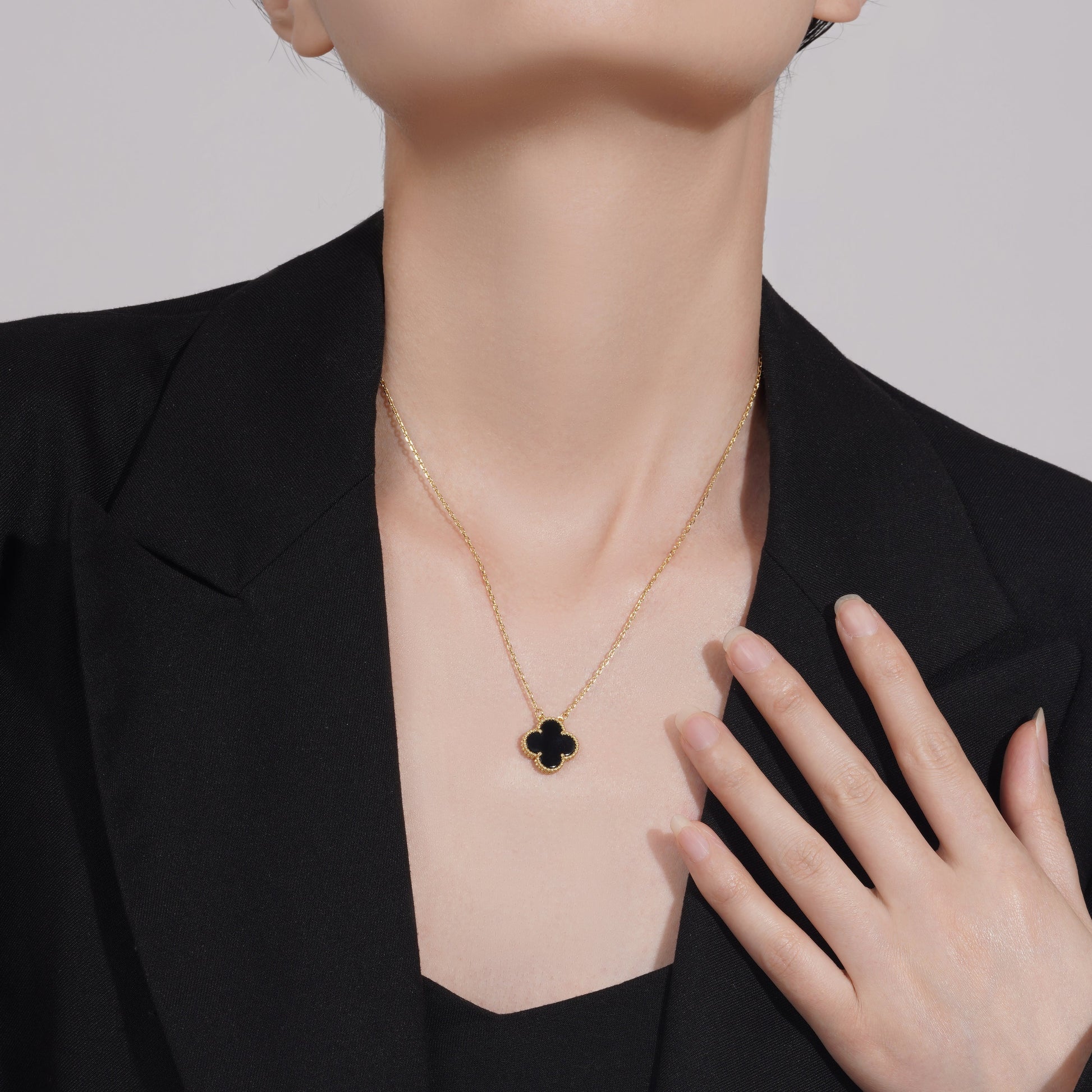 Add a touch of elegance with this handcrafted Clover Leaf Necklace, featuring a mix of White Mother-of-Pearl, Black Onyx, Red Carnelian, Green Malachite, Tiger Eye, and gold-plated accents. Expertly crafted from 925 silver with 18K gold plating and a PVD 5x layered finish, this necklace combines durability with timeless style. Chain length: 16.5 inches.