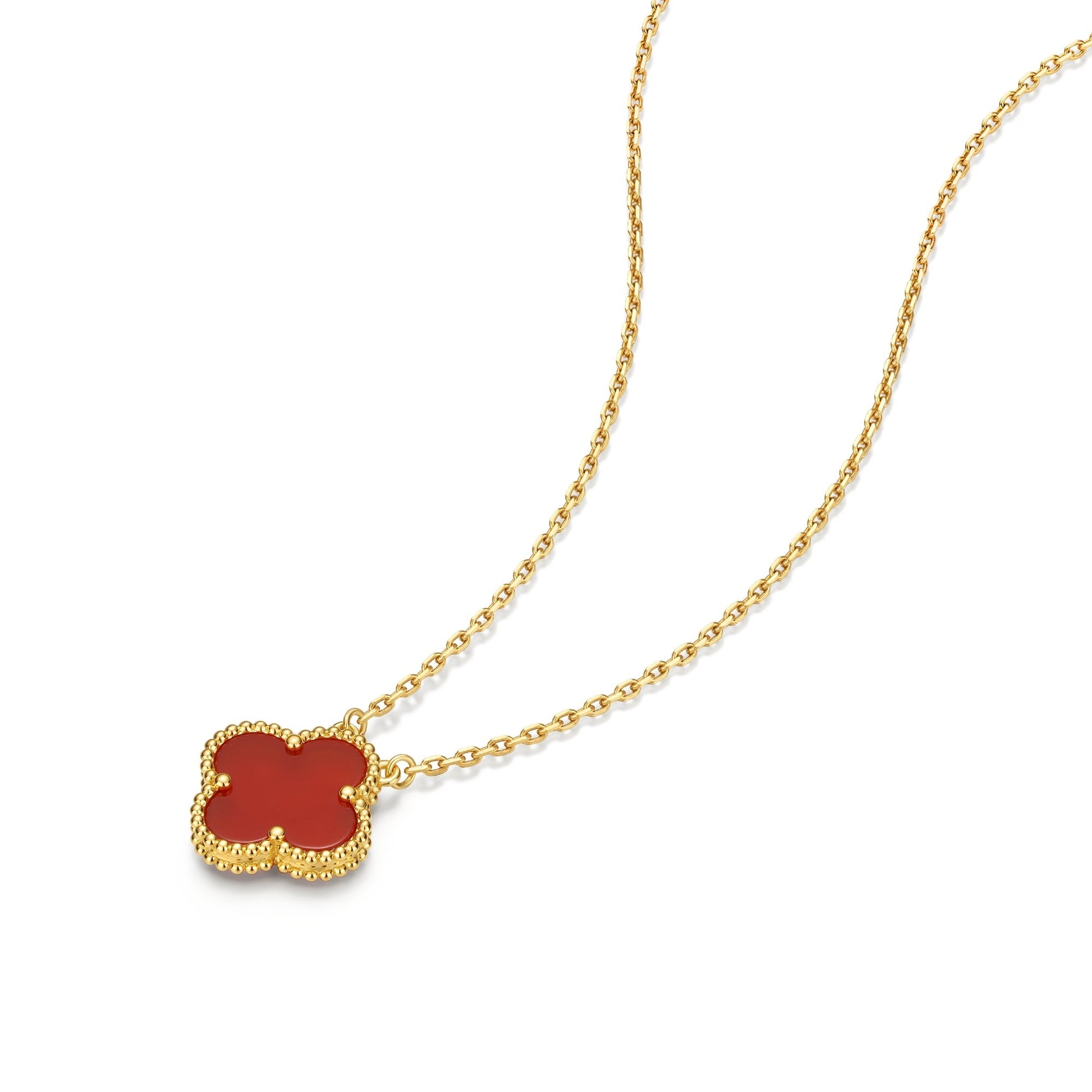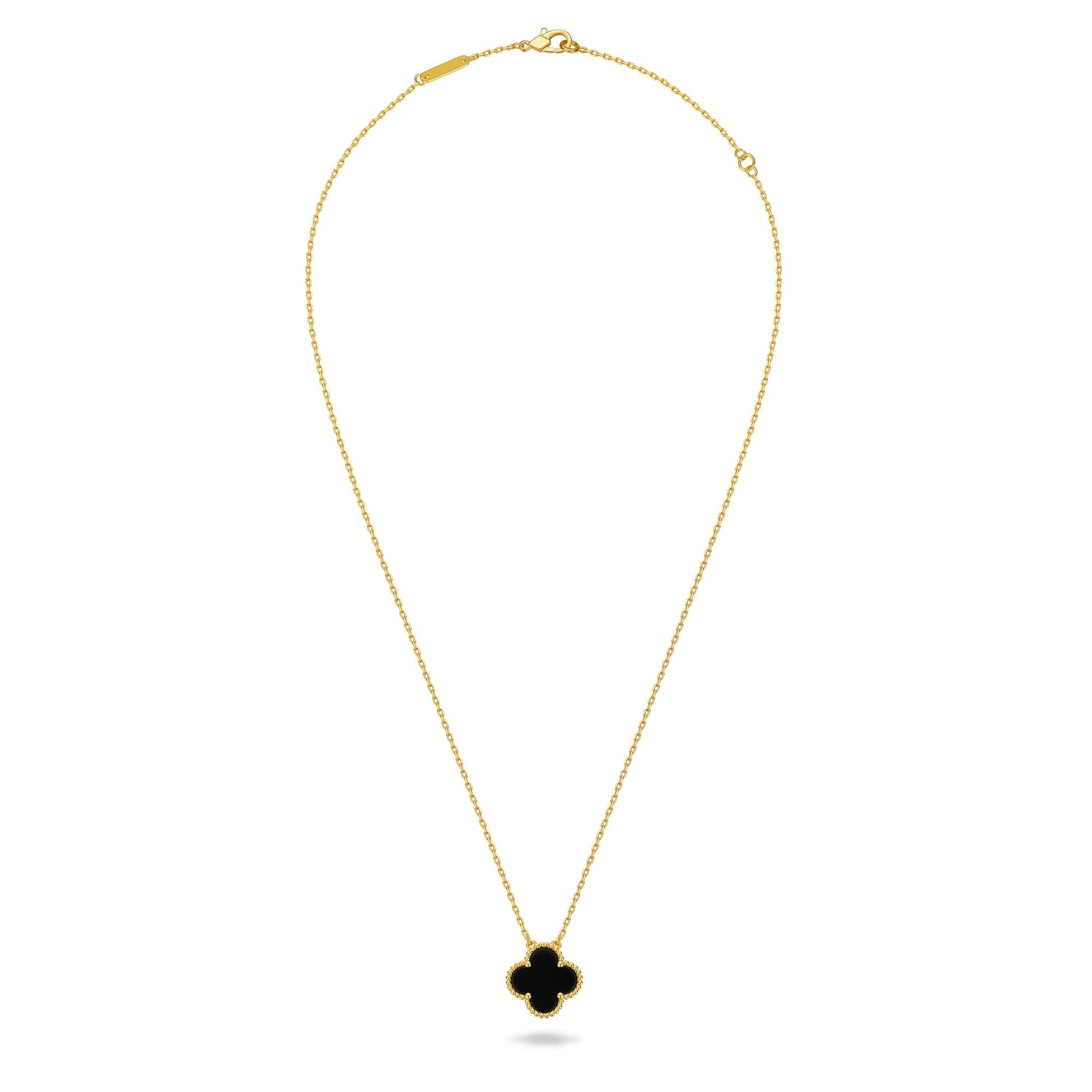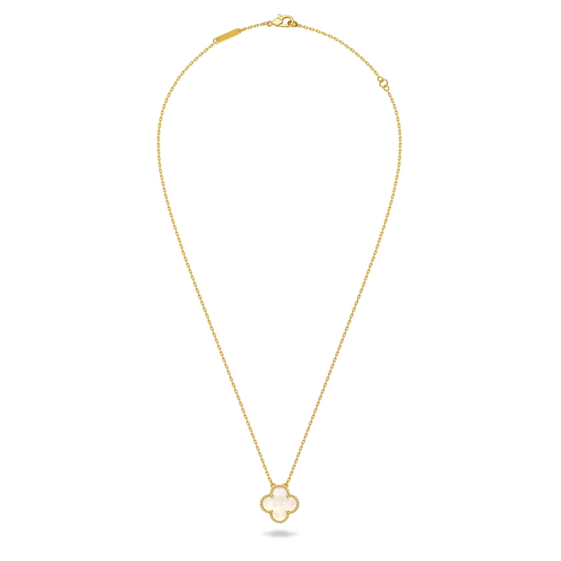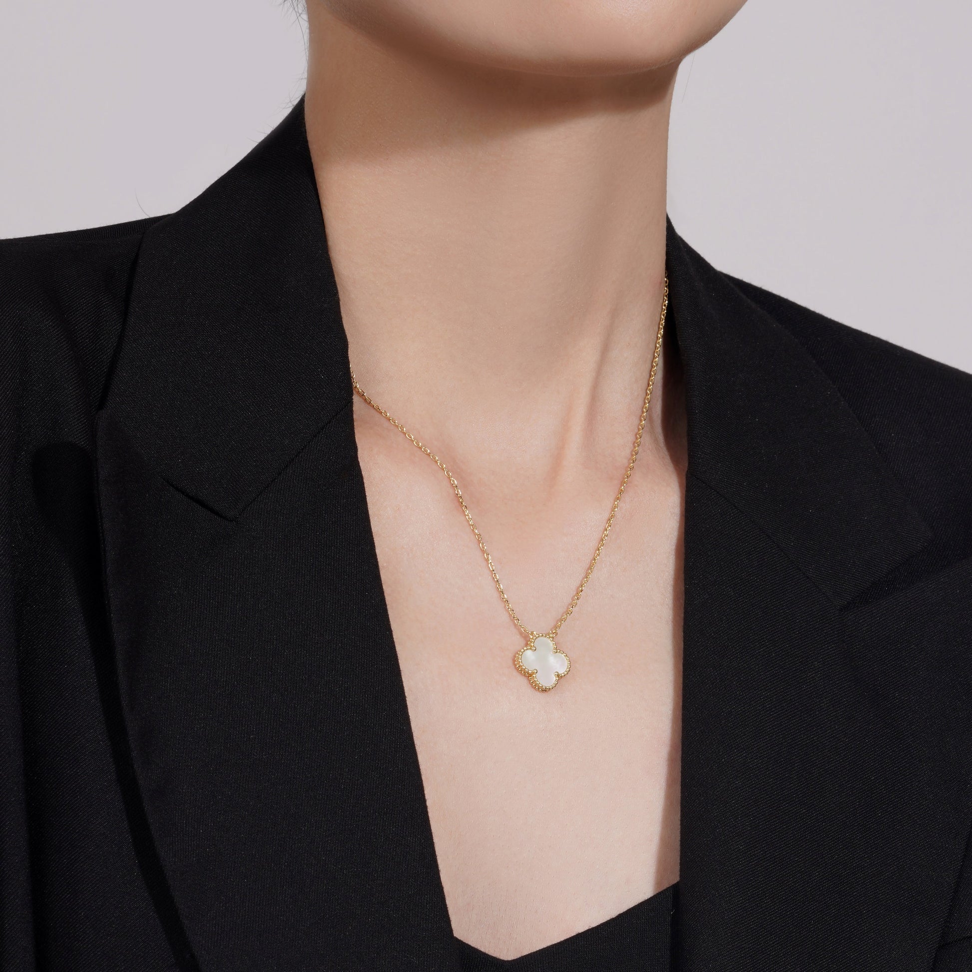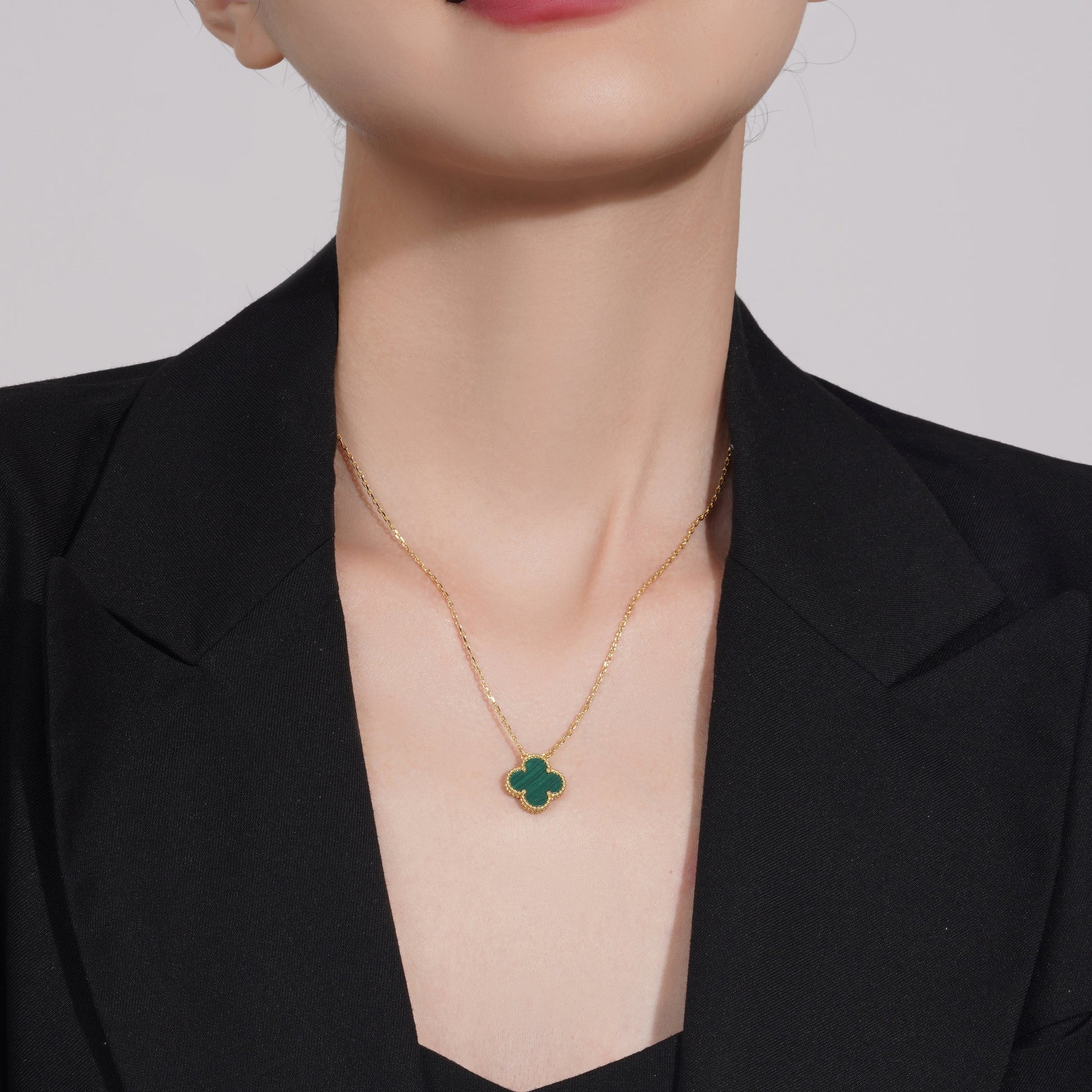 Add a touch of elegance with this handcrafted Clover Leaf Necklace, featuring a mix of White Mother-of-Pearl, Black Onyx, Red Carnelian, Green Malachite, Tiger Eye, and gold-plated accents. Expertly crafted from 925 silver with 18K gold plating and a PVD 5x layered finish, this necklace combines durability with timeless style. Chain length: 16.5 inches.