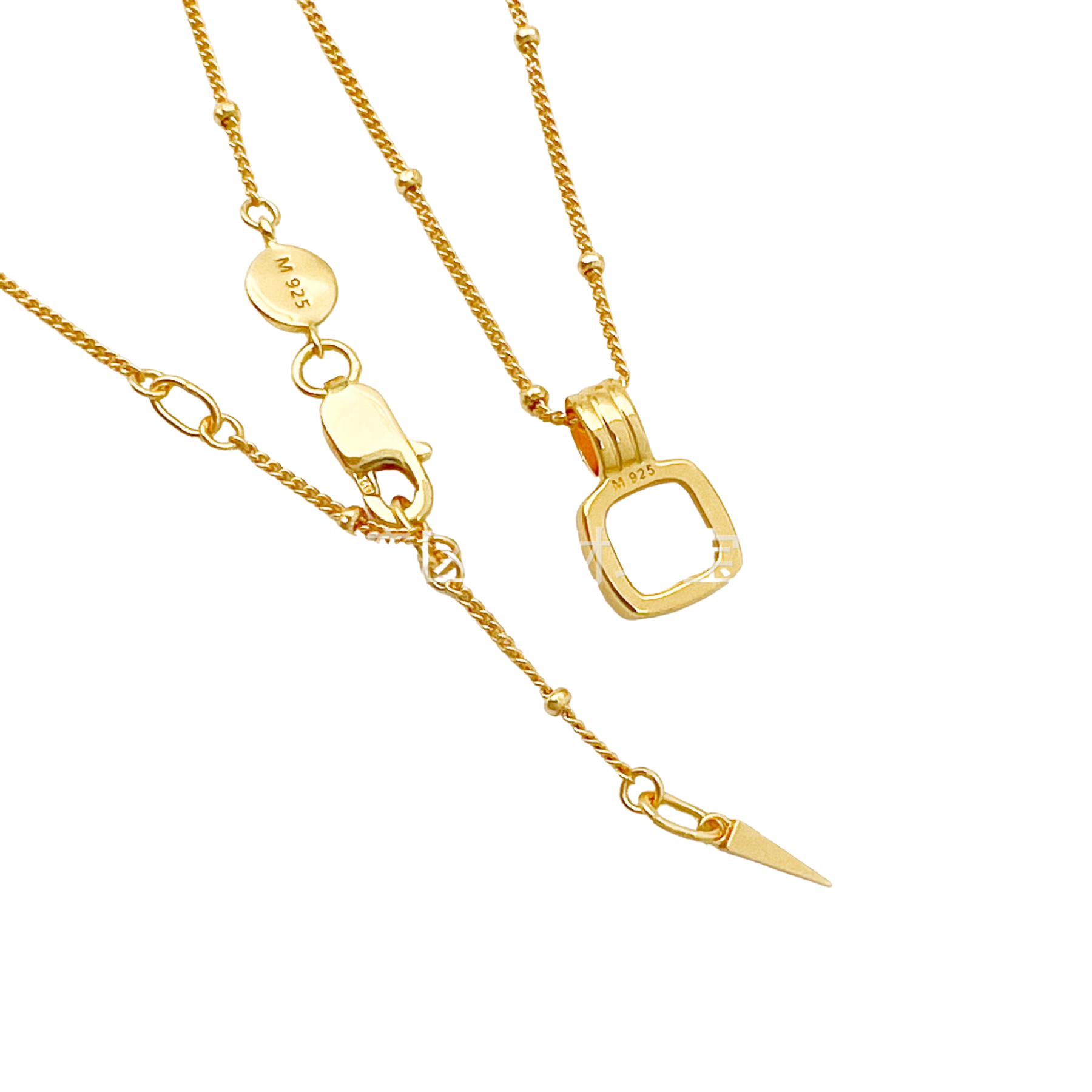 This necklace features a square mother of pearl pendant paired with a delicate ball-bead chain. Designed with triple ridged links, it serves as a unique focal point and is believed to attract abundance and prosperity. Perfect for layering—pair it with a coin choker for a timeless duo.