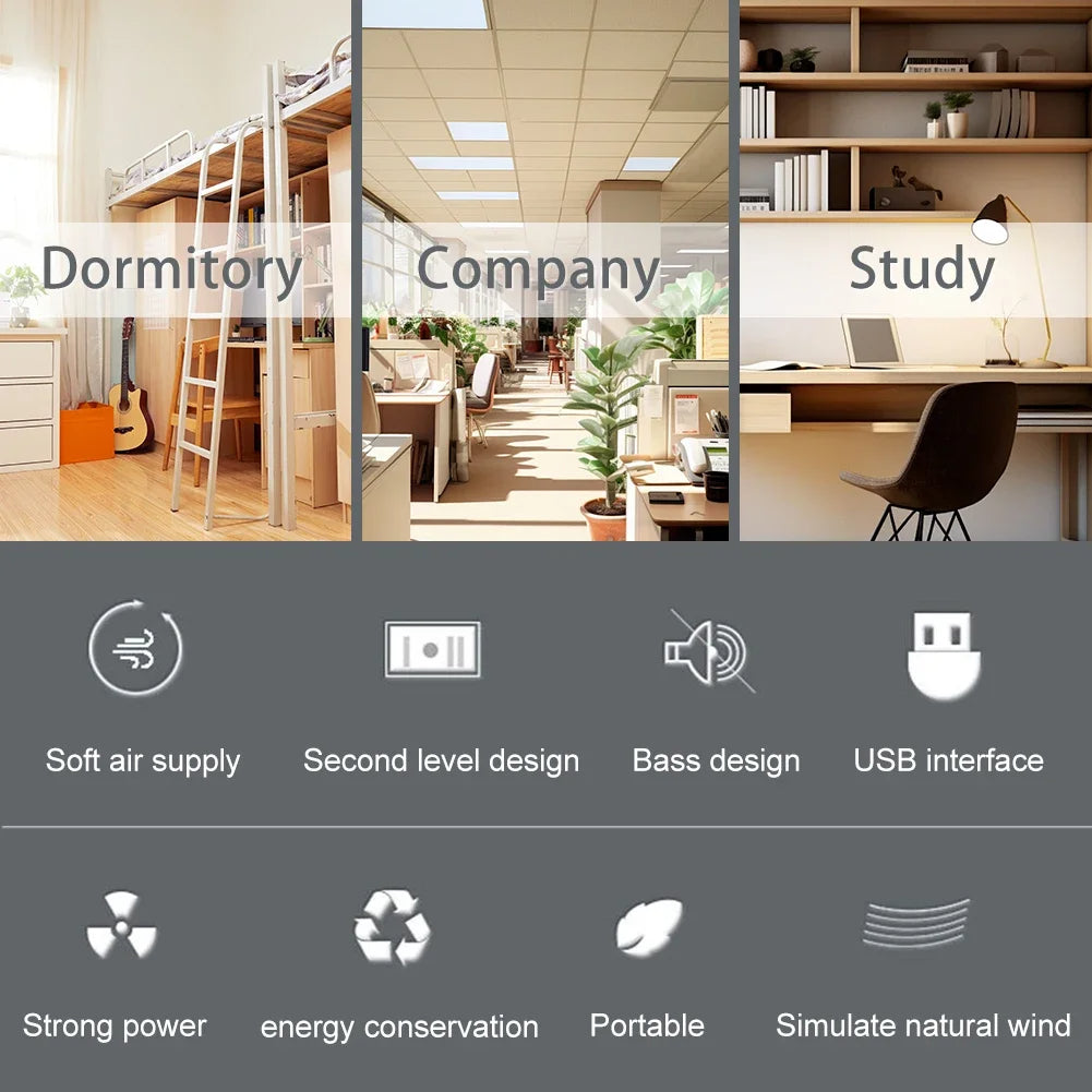 Este enfriador de aire portátil para uso en habitaciones, alimentado por USB, es versátil y fácil de alimentar mediante diversas fuentes como laptops, bancos de energía o adaptadores de pared. Ya sea en casa o en movimiento, puede llevar este ventilador compacto a cualquier lugar para mantener un espacio fresco y agradable.
