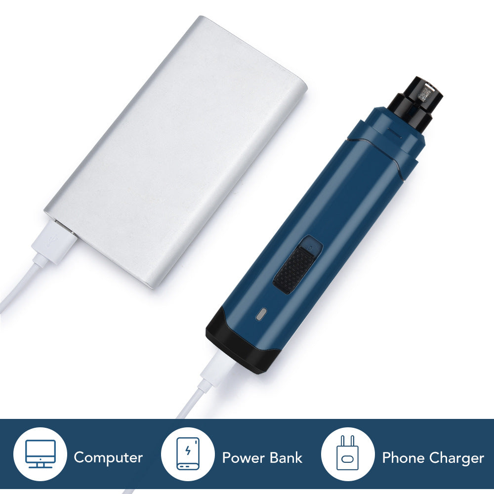 • Recargable y portátil: El molinillo de uñas para mascotas inalámbrico es recargable y tiene una luz indicadora en la parte inferior que se enciende al cargar. El diseño ligero y ergonómico del cuerpo también facilita su manejo con la mano derecha o izquierda