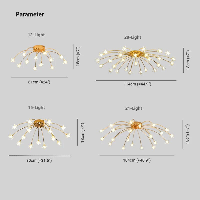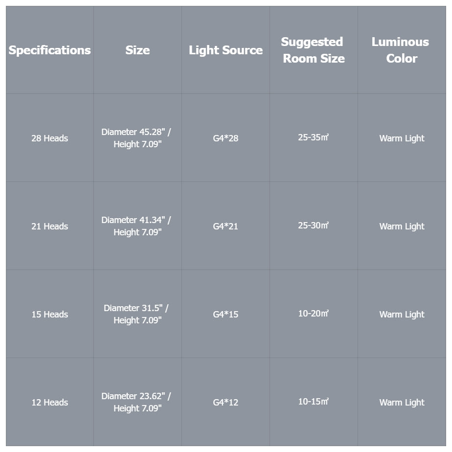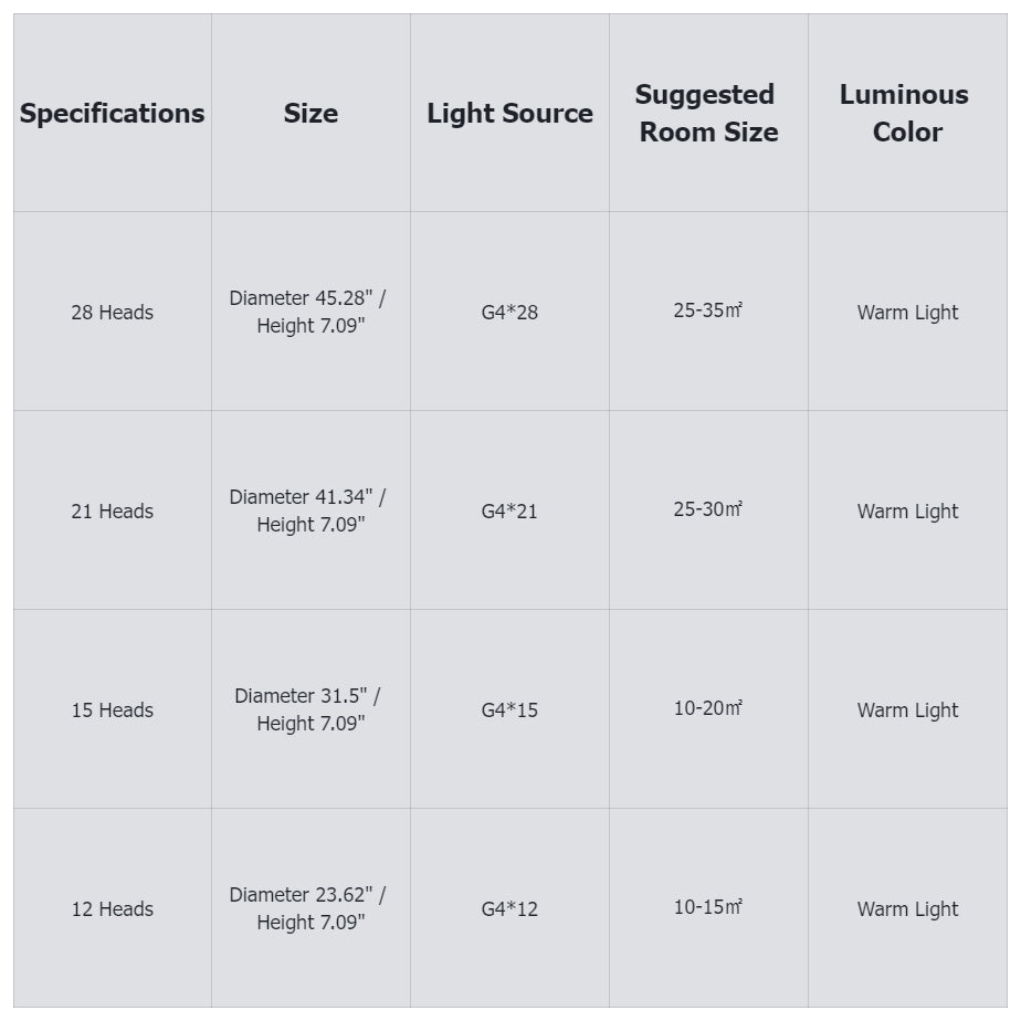 • Opciones personalizables: Disponible en cuatro tamaños diferentes (12, 15, 21 y 28 cabezas) y tres opciones de color, incluyendo blanco cálido, blanco natural y blanco frío, esta lámpara de techo te permite personalizar el tamaño y la temperatura de color para adaptarse a tus preferencias y decoración interior.