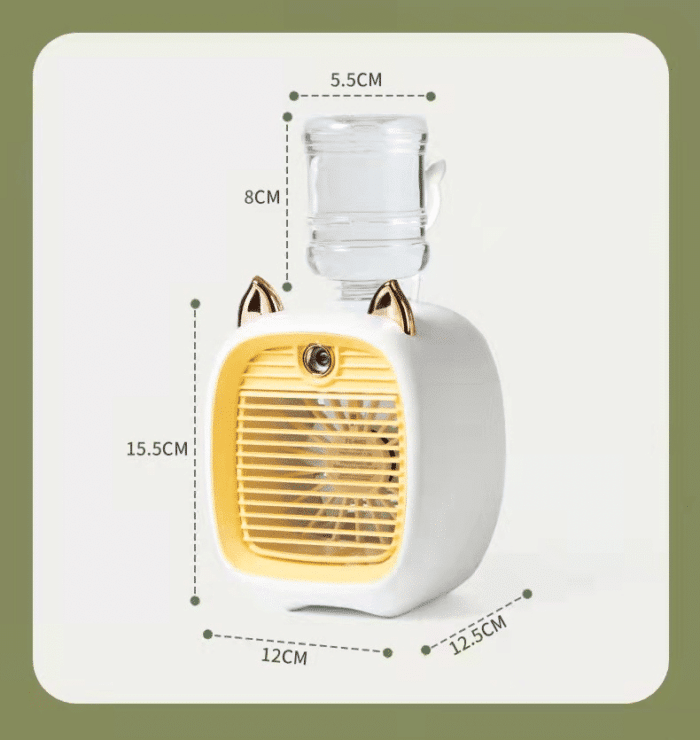 Un ventilador y aire acondicionado USB ligero diseñado para ofrecer refrigeración dirigida para escritorios, habitaciones pequeñas o viajes. Esta unidad portátil combina flujo de aire, niebla y enfriamiento evaporativo en un solo dispositivo eficiente en energía.