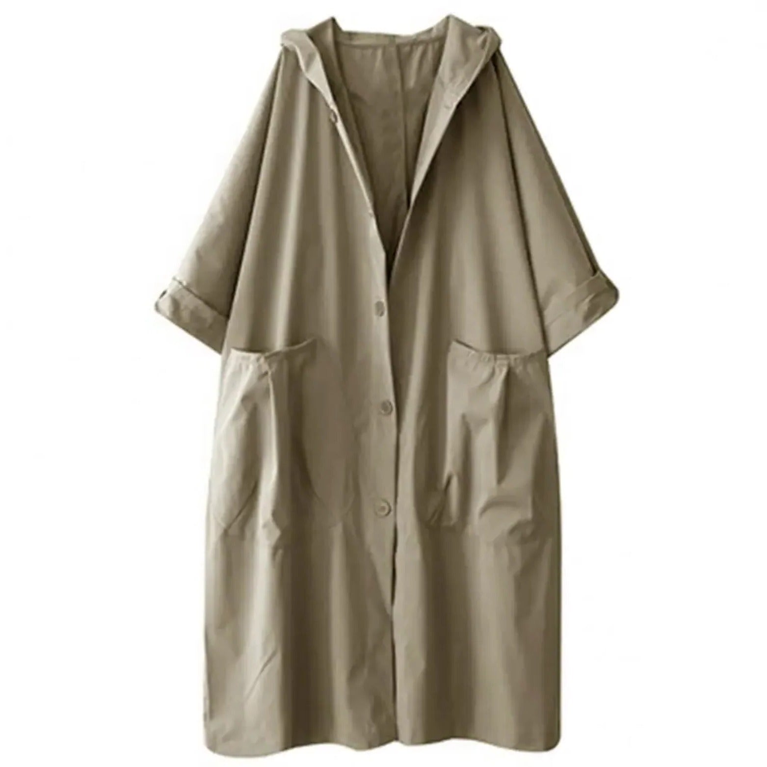 Este abrigo tipo trench presenta una silueta larga con diseño con capucha, cierre funcional de botones frontales y bolsillos sobredimensionados. El ajuste holgado ofrece un rango completo de movimiento, haciéndolo adecuado para uso diario durante el clima de transición. Su tono neutro y estructura práctica se adaptan tanto a vestimenta casual como semiformal.