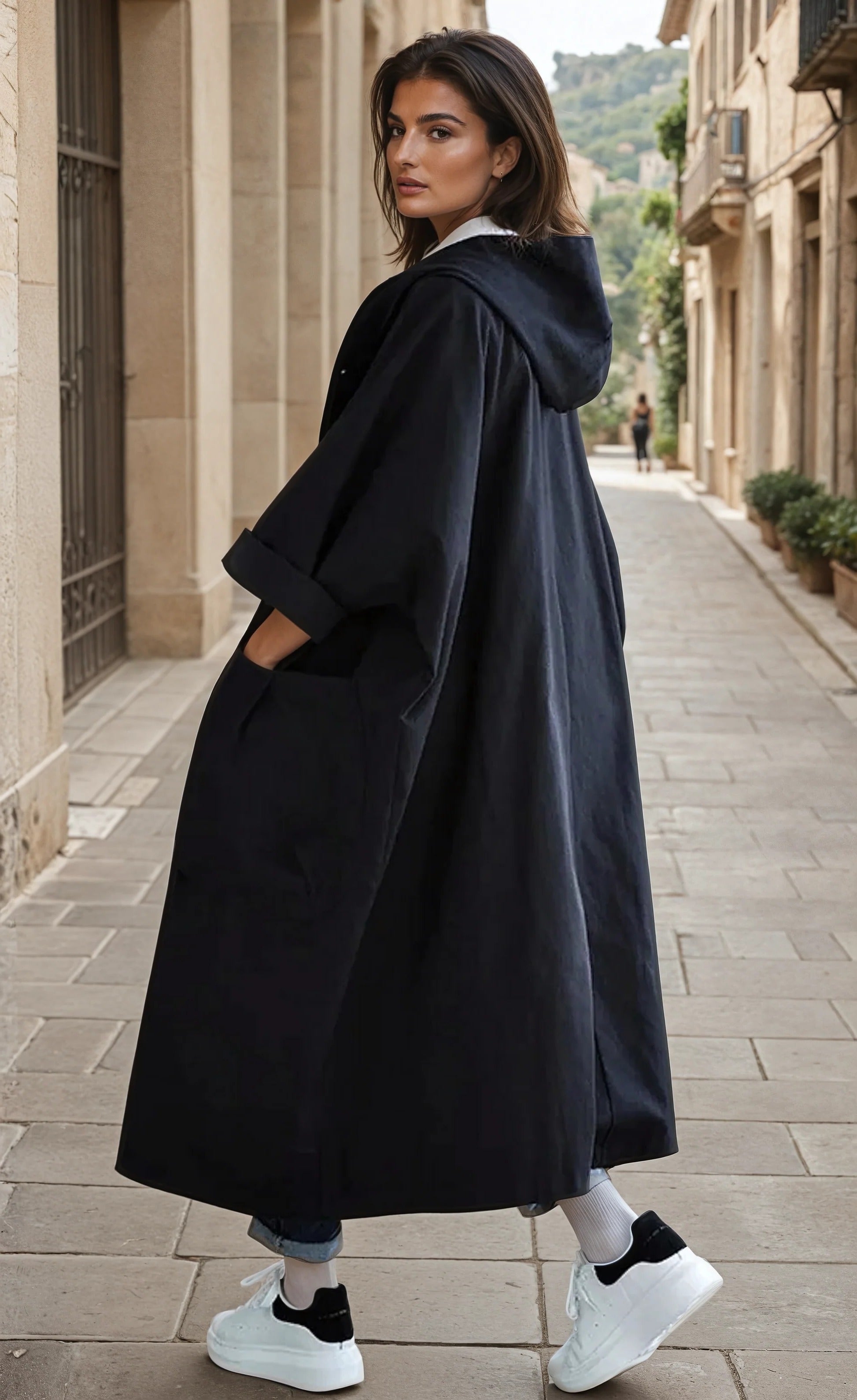 - Diseño con capucha de longitud completa – Proporciona cobertura extendida con una estética minimalista.