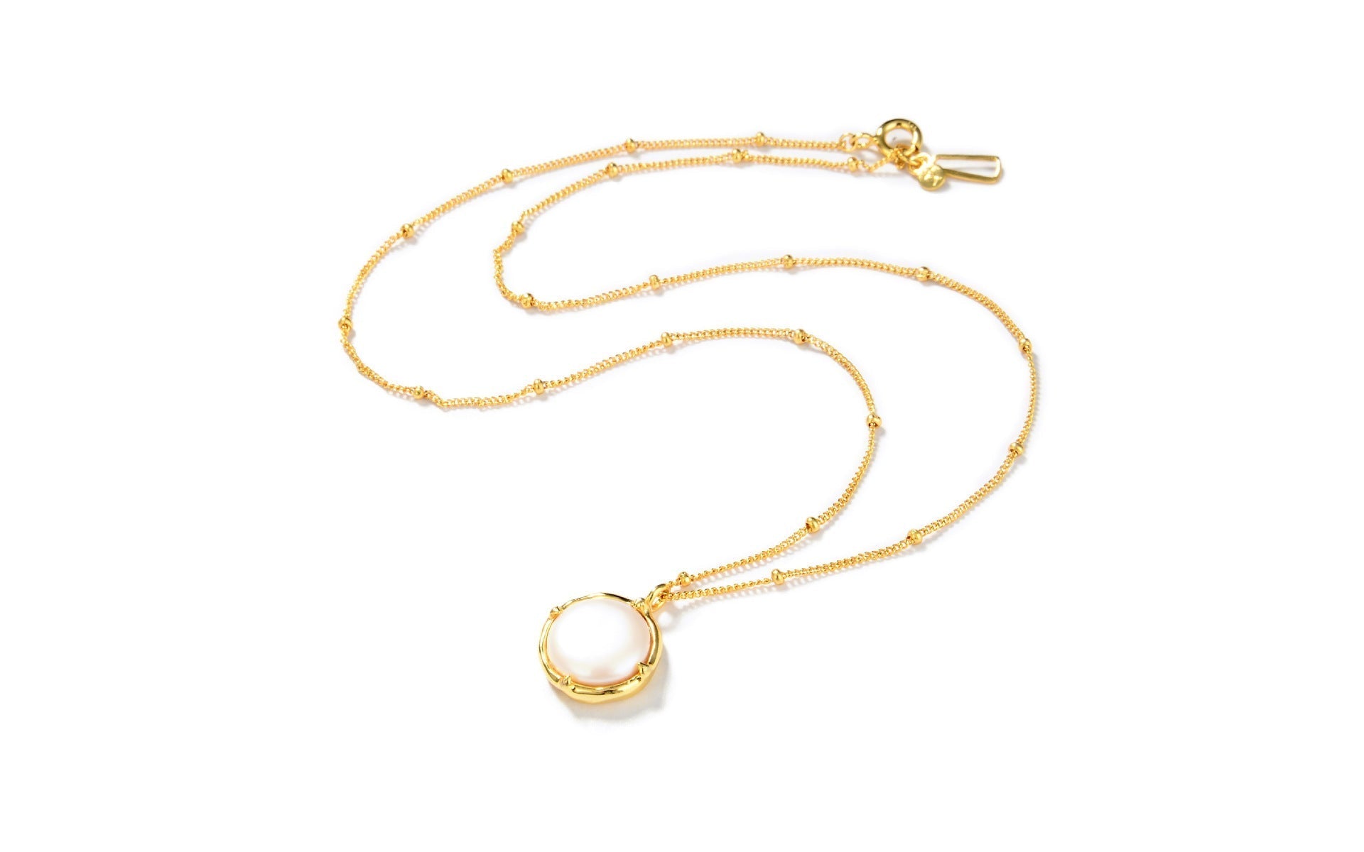 Handcrafted baroque button pearl necklace featuring natural freshwater pearls. Comes with a 16.5-inch chain and a 0.51 × 0.51 inch pendant, offering a timeless and elegant look.