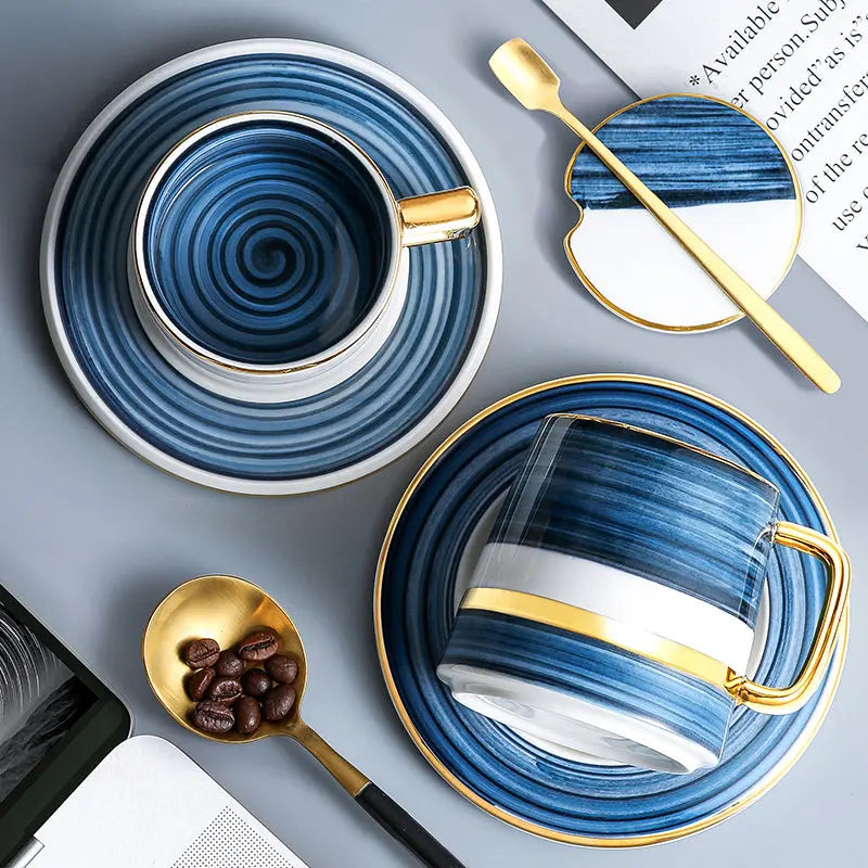 Ideal for everyday use or to WOW your guests, these Belgian mug sets in shades blue of blue with gold rim are stylish, elegant and durable. Made from durable ceramic each mug has a simple yet modern shape with tones of blue throughout and is finished with a gold-coloured rim. Each set consists of a mug, saucer, lid and a gold spoon.