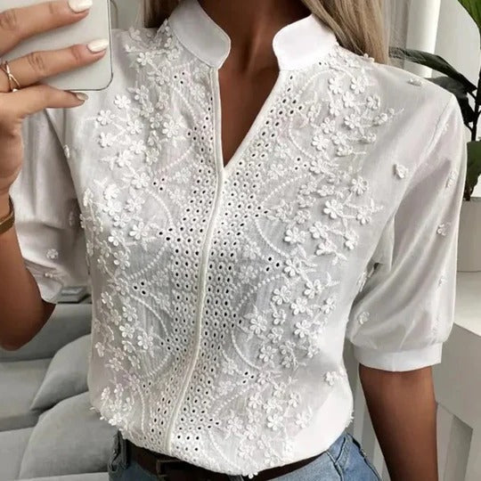The blouse includes subtle design elements such as gentle draping and a clean finish. It can be layered or worn alone, depending on temperature and style preferences.