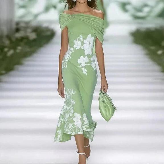 This women’s dress features an off-shoulder neckline, a fitted waist, and a midi-length cut. Designed with a floral pattern and structured for spring and summer use, it is suitable for parties, weddings, and evening events.