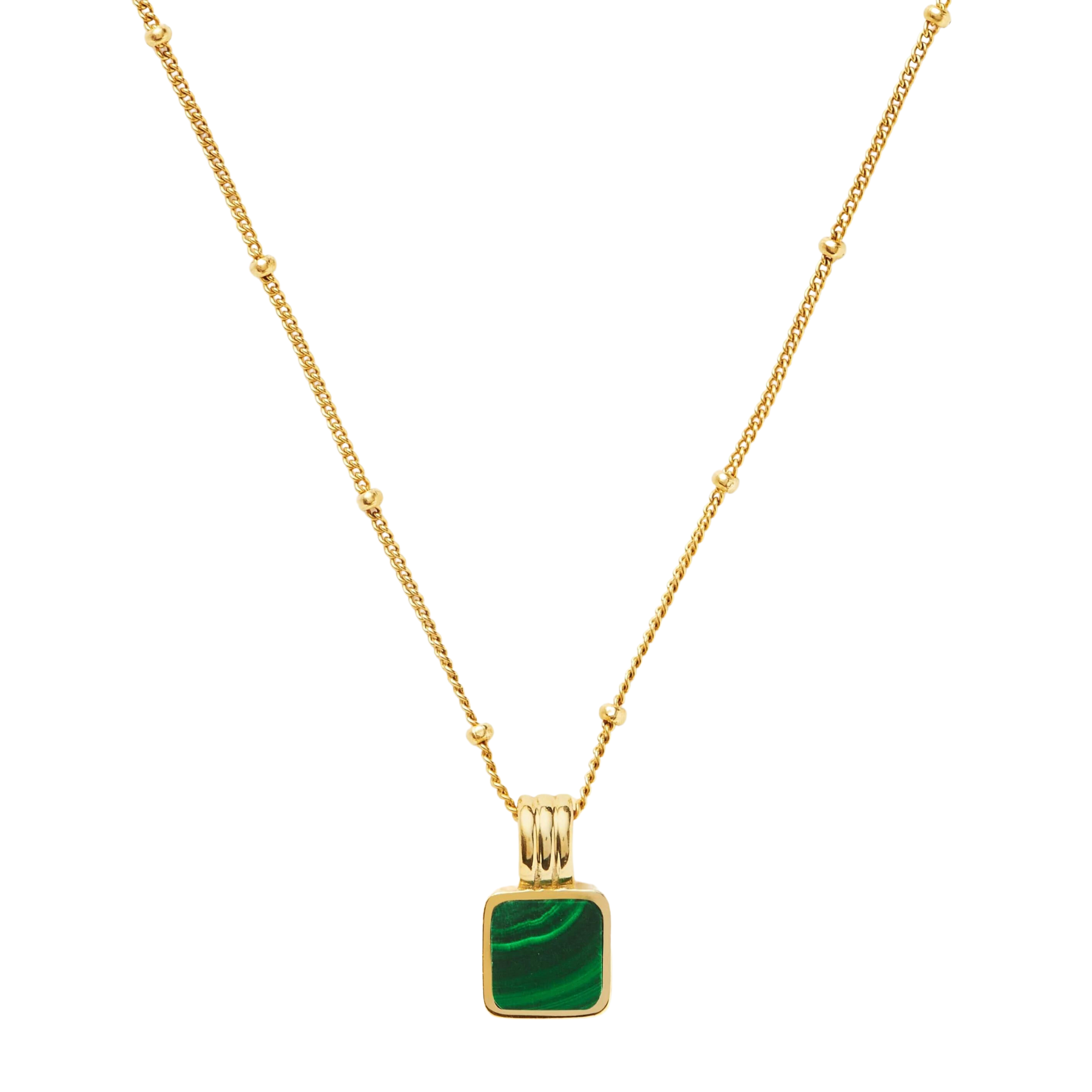 This handcrafted necklace features a hand-cut malachite gemstone set in an 18K gold-plated pendant. Malachite is traditionally regarded as a protective stone, especially valued during travel or transshipment, making this necklace both beautiful and meaningful.